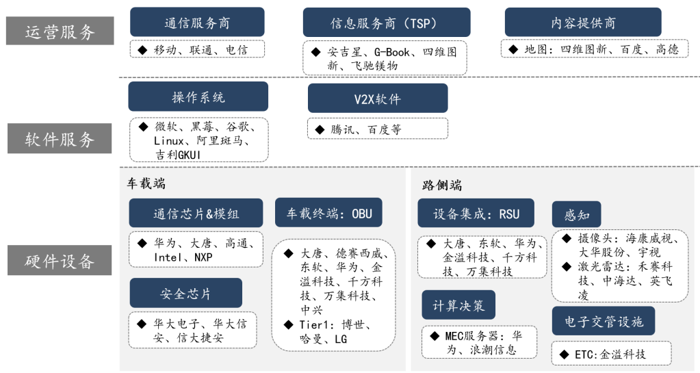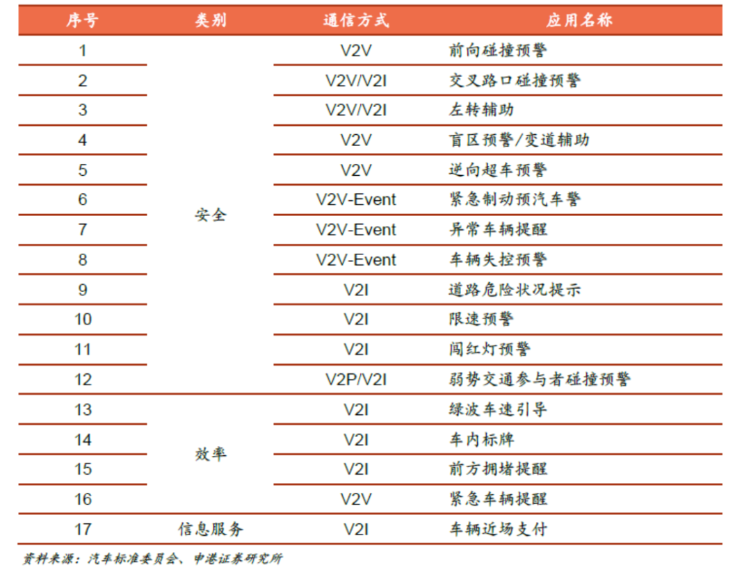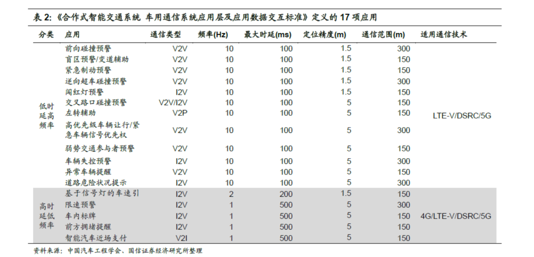 V2X(车辆连接一切,vehicle-to-everything),其希望实现车辆与一切可能影响车辆的实体实现信息交互,目的是减少事故发生,减缓交通拥堵,降低环境污染以及提供其他信息服务。V2X交互的信息模式包括:车与车之间(Vehicleto Vehicle,V2V)、车与路之间(Vehicle to Infrastructure,V2I)、车与人之间(Vehicle to Pedestrian, V2P)、车与网络之间(Vehicle to Network, V2N)的交互。 V2V是指通过车载终端进行车辆间的通信。车载终端可以实时获取周围车辆的车速、位置、行车情况等信息,车辆间也可以构成一个互动的平台,实时交换文字、图片和视频等信息。V2V通信主要应用于避免或减少交通事故、车辆监督管理等。 V2I是指车载设备与路侧基础设施(如红绿灯、交通摄像头、路侧单元等)进行通信,路侧基础设施也可以获取附近区域车辆的信息并发布各种实时信息。V2I通信主要应用于实时信息服务、车辆监控管理、不停车收费等。 V2P是指弱势交通群体(包括行人、骑行者等)使用用户设备(如手机、笔记本电脑等)与车载设备进行通信。V2P通信主要应用于避免或减少交通事故、信息服务等。 V2N是指车载设备通过接入网/核心网与云平台连接,云平台与车辆之间进行数据交互,并对获取的数据进行存储和处理,提供车辆所需要的各类应用服务。V2N通信主要应用于车辆导航、车辆远程监控、紧急救援、信息娱乐服务等。 车联网V2X行业主流技术路径有两种,一种是欧美主导的DSRC标准(全称是dedicated short range communication,专用短距离通信技术),另一种为C-V2X标准(Cellular V2X,即以蜂窝通信技术为基础的V2X),C-V2X标准的专利分布更利于我国,技术路线的发展前景更广阔,但相对不成熟。DSRC 在性能上存在局限性——难以支持高速移动场景,移动速度一旦提高,DSRC 信号就开始骤降、可靠性差、时延抖动较大,所以很长一段时间DSRC 的性能不稳定,一直处于测试阶段。同时,DSRC 技术的组网需要新建大量路侧单元,这种类基站设备的新建成本较大,其硬件产品成本也比较高昂。而C-V2X 可以通过结合路侧单元(RSU)和现有的面向网络通信的蜂窝基础设施,将V2N、V2I 的功能与4G/5G 基础设施及其回传链路相结合,从而不需要单独建站部署,降低部署成本,带来重要的经济效益。从2016年的技术路线变化来看,C-V2X路线成为了各类示范区的主流选择。另一方面,越来越多的项目开始前瞻规划5G技术落实在车联网场景的应用,随着5G R16标准的冻结日益临近,采用5G-V2X技术的示范区占比有望持续提升。 采集车与众包绘制 V2X的应用 美国交通局USDOT基于2004 - 2008年交通事故分析得出以下结论:使用V2X系统可以降低450万起碰撞事故(占多车碰撞总数的81%)。V2X 在欧洲电信标准化协会(ETSI)中定义了53 个应用场景,在3GPP 中定义了27 个应用场景,主要包括交通安全与交通效率两大类。我国汽车标准委员会规划了V2X 17种应用场景,具体如下: 列队跟驰:头车为有人驾驶车辆或自助式自动驾驶车辆,后车通过V2X通信与头车保持实时信息交互,可实现一定车距的多车稳定跟车。列队跟驰可减少运输企业对于司机的需求,降低驾驶员的劳动强度,减小车队行驶中的风阻,并且降低车辆油耗,还可释放更多车道给其他车辆通行,显著改善交通拥堵并提升运输效率,进一步缓解交通压力。 2019年5月7日,我国首次大规模商用车列队跟驰标准公开验证试验在天津市西青区成功举行。受汽标委智能网联汽车分标委邀请,来自中国重汽、东风商用车、福田戴姆勒三家车企9辆重型商用车分为3组对《智能网联汽车自动驾驶功能测试方法及要求第3部分列队跟驰功能》进行公开验证试验。 道路危险状况提示:主车在前方有施工、桥下有积水、路面坑道湿滑、前方急转弯等情境下路段行驶时 ,道路单元 RSU将广播信息发送,车将广播信息接收后预警驾驶员,提醒减速或绕行。 交叉口通行:主车向 V2X服务器发送车辆行驶信息,服务器根据车辆行驶信息和叉路口的交通信息,为主车生成通过交叉路口的行驶调度信息发送给主车 ,通过路侧RSU获取相关感知信息。 紧急车辆避让:紧急车辆(RV)与主车(HV)通过V2V交互自车位置及运行状态信息,主车V2X车载终端接收紧急车辆靠近信息并向主车发出紧急车辆优先通行预警,离开专用道或实现避让。 突发恶劣天气提醒:采用一体式交通气象监测器,同时对采用一体式交通气象监测器同时对雨、雪雾横风等各种异常天气及结冰雨、 雪雾横风等各种异常天气及结冰积水等异常道路环境进行检测,后发送数据给路测单元RSU,路测单元RSU及时对车辆发送提醒。2019年4月通车的虎门二桥由金溢科技提供顶层设计方案和软硬件产品,实现了恶劣天气提醒的应用场景。 绿波通行:消防车、救护车、公交车等特殊车辆通过交叉路口时,通过V2I与交通信号灯互动,根据交通流状况与车辆通行优先级动态调整交通信号灯配时。 2019年,深圳市交通运输局宝安管理局开辟了从11号线塘尾地铁站到国际会展中心的智慧公交专线,可实现智慧公交到达信号灯路口时红灯信号时间缩短,绿灯时间延长。 盲点提醒:主车试图换道或处于十字路口时,系统若发现相邻行车线有车辆出现在驾驶者的盲点时,会向驾驶者发出盲点来车警告。 前撞预警:当前车发生制动、停车、行驶缓慢等行为,若主车没有采取制动措施,系统会向驾驶者发出提醒。 交叉口辅助驾驶:车辆进入交叉口、处于危险状态(如障